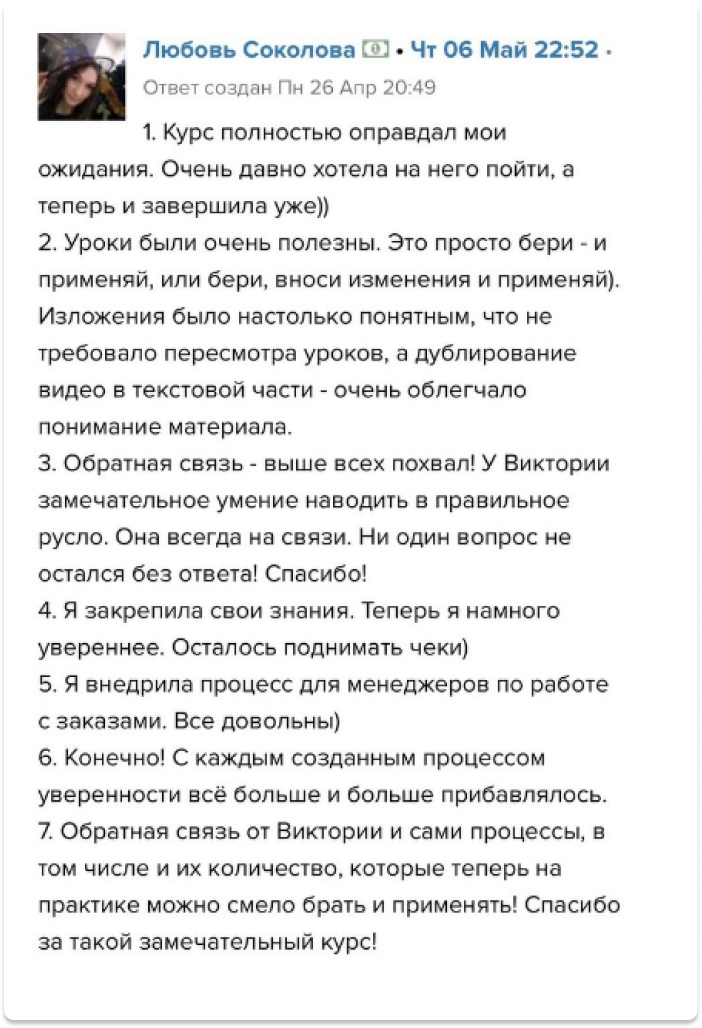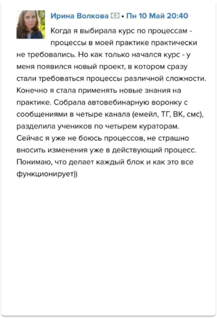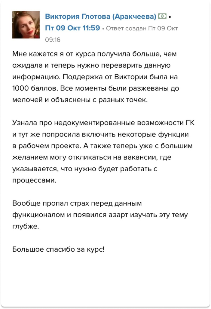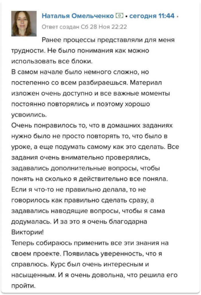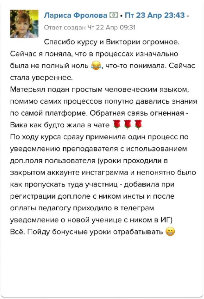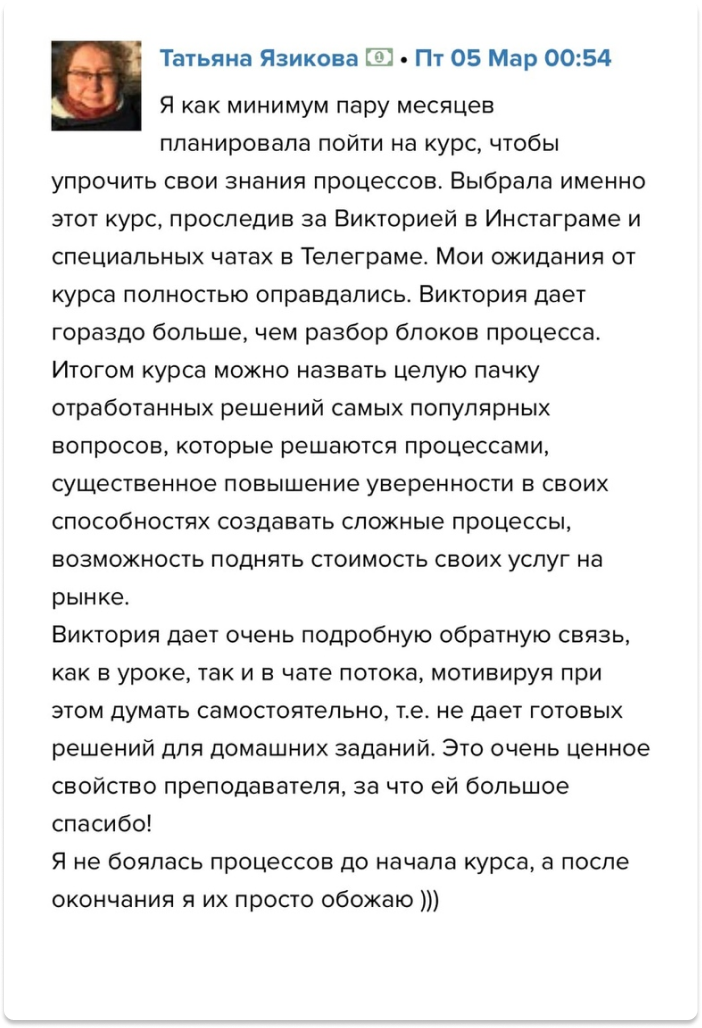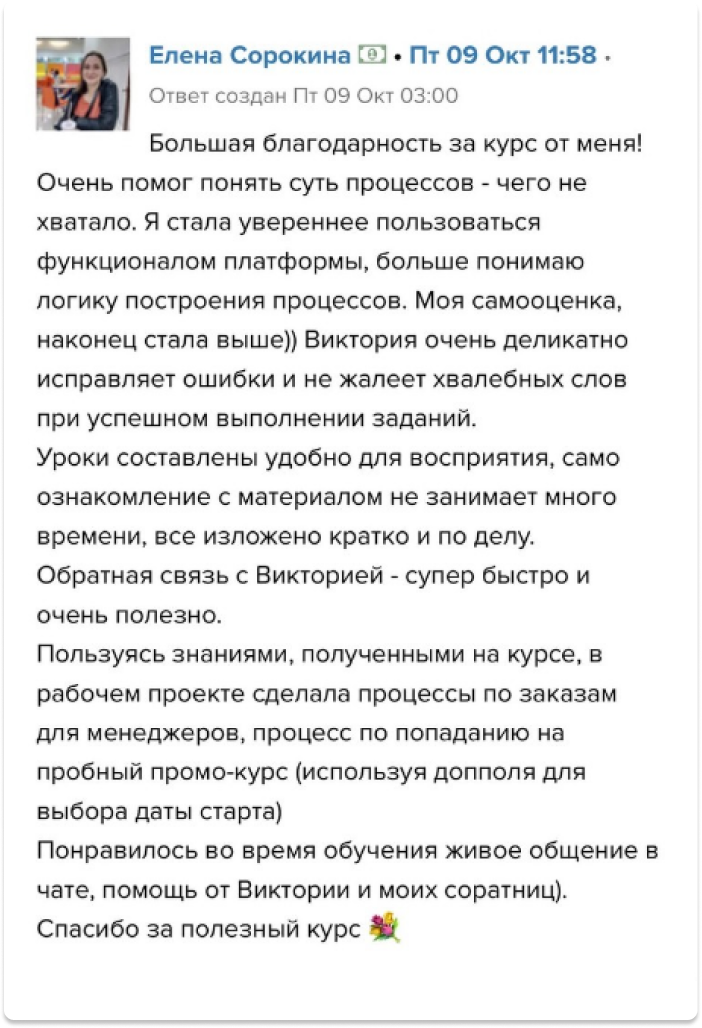 - 4 онлайн-встречи с экспертом Викторией Алексеевой, на которых вы будете получать обратную связь по собранным вами процессам и рекомендации по созданию схем рабочих процессов, чат-ботов и автоворонок